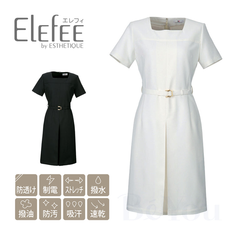 ベルトのアクセントで存在感を誰にでも上品に着こなせるシンプルなデザインに、オシャレ感のある共布のベルトを合わせたスタイル。スカートの前のボックスプリーツにより、動きやすく、足を開く作業でも安心。