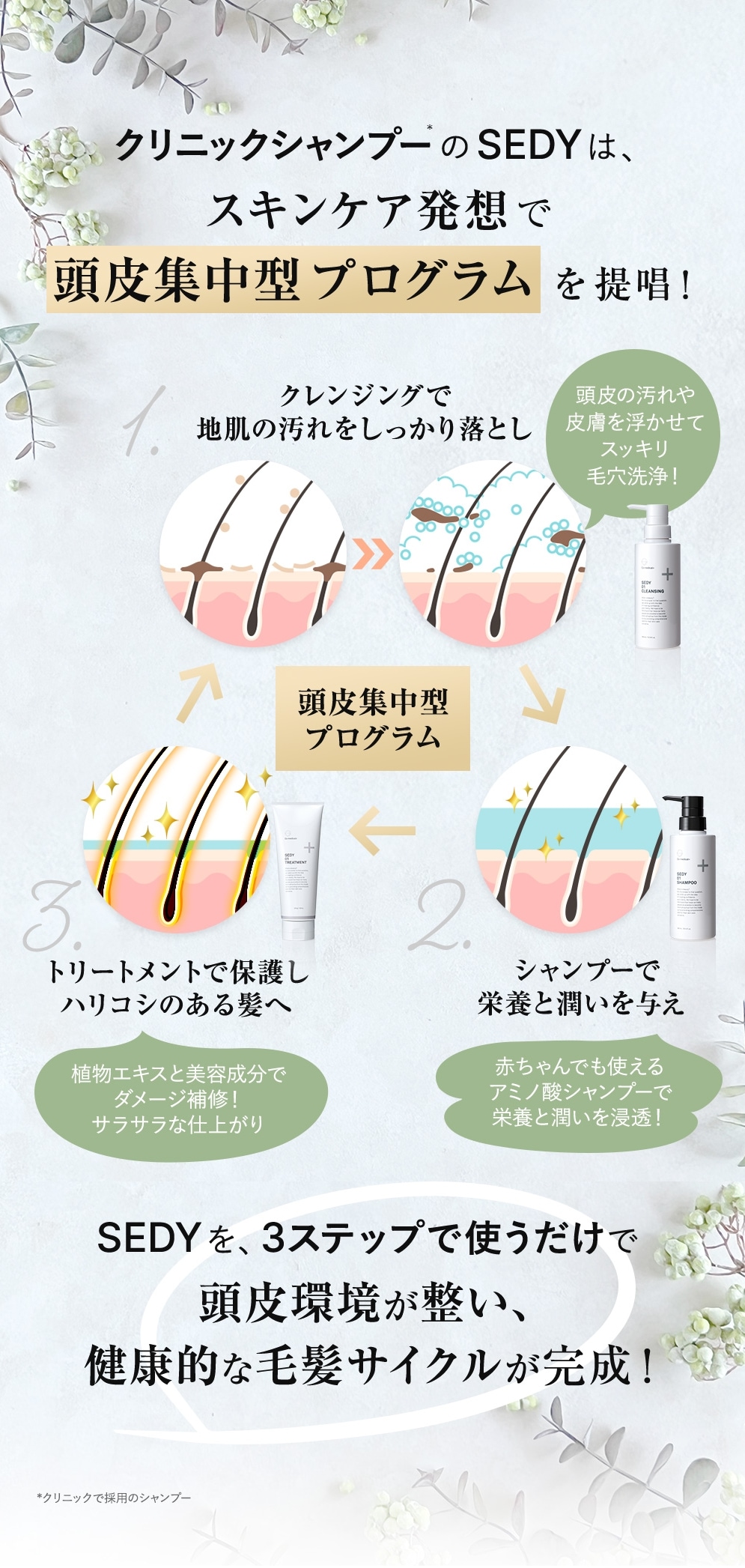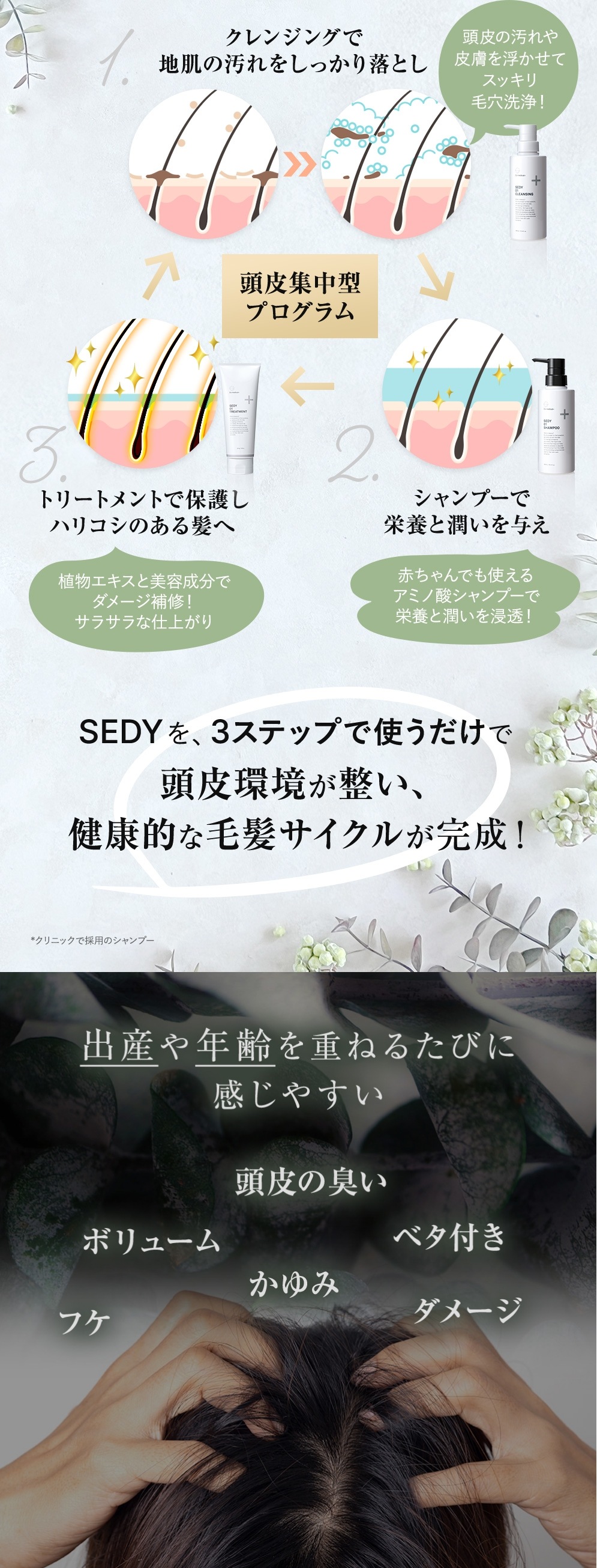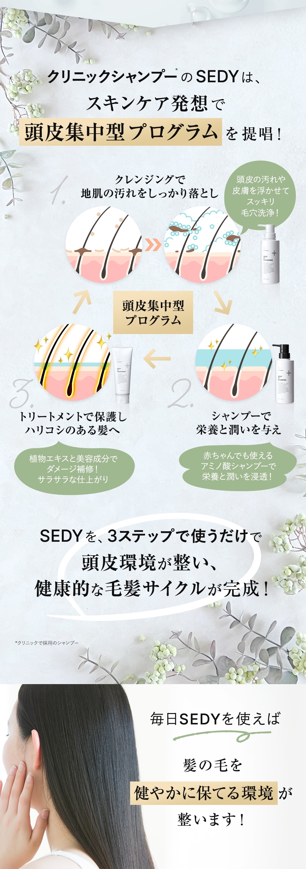 SEDY クレンジングは、植物由来の洗浄成分で頭皮の汚れや皮脂を浮かせて落とし、植物由来成分を補給しながら洗い上げるクレンジングシャンプーです。