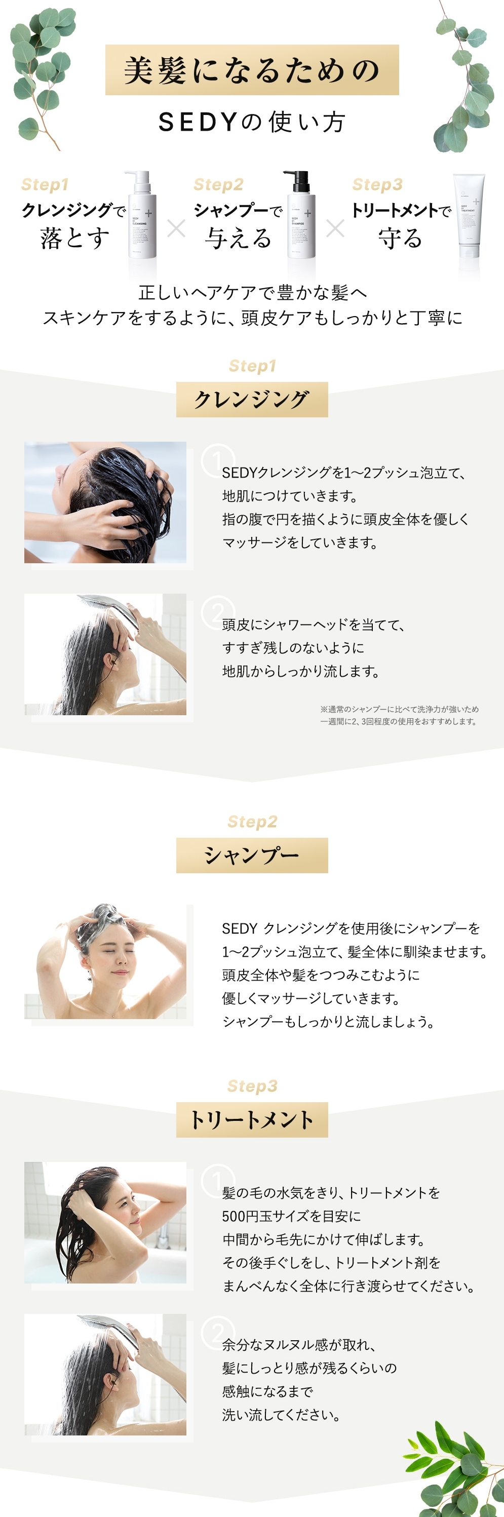 ブラッシングでホコリなどを落とした後、しっかり髪を濡らします。 その後、クレンジングの効果を最大限に得るために髪の水気をしっかりきりましょう。 そうしたら、SEDY クレンジングを手のひらになじませます