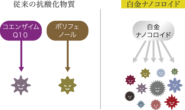 それに比べ、プラチナシリーズに含まれる白金ナノコロイドは全ての活性酸素を除去する効果があります。