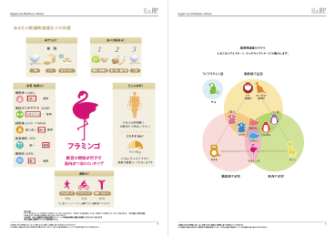 H&BPの検査で分析した結果は大ボリュームのアドバイスブックにまとめられて届きます。結果は9タイプ、12種類の動物キャラクターに分類されており、親しみやすく、わかりやすくまとまっています。先天的要因の遺伝子検査に加え、後天的要因であるライフスタイル(食習慣等)も分析することで、完全オーダーメイドの報告書となります。