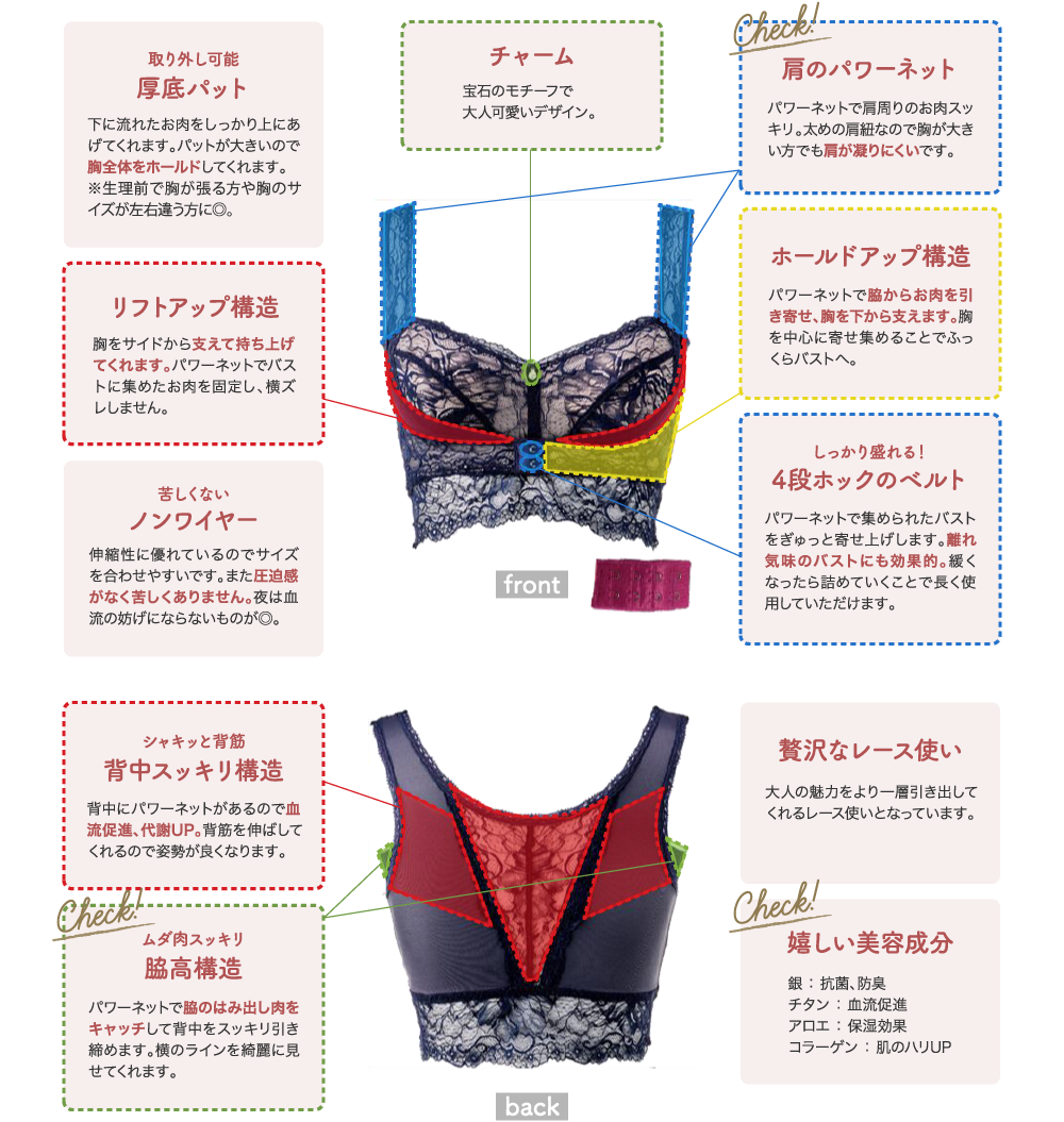 脇のすぐ下までパワーネットがあるので、脇にはみ出しそうなお肉も余すことなくカップに納めてくれるのが嬉しいです!
