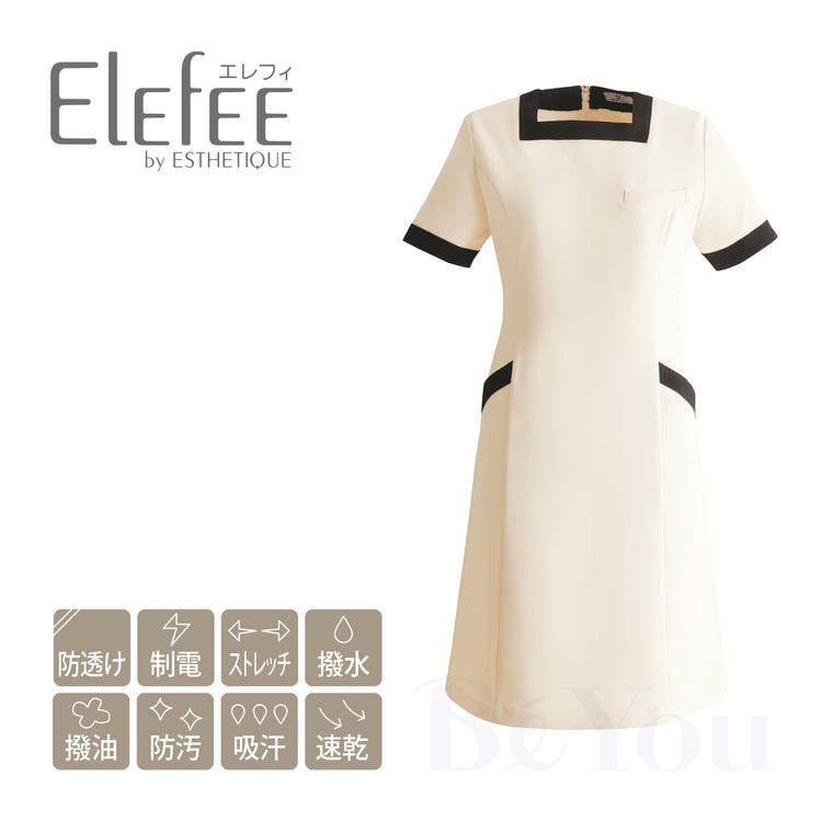 デコルテもスタイルも美しく 衿元のスクエアカットが女性のデコルテを美しく演出する美人ワンピース。ブラックの配色できりっと引き締め効果のあるデザインです。華やかさが香るエレガントな一着です。